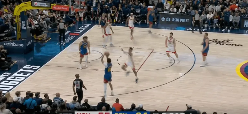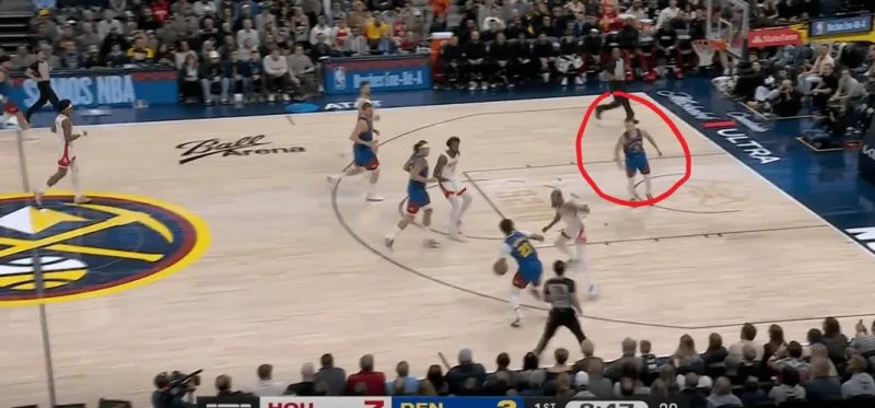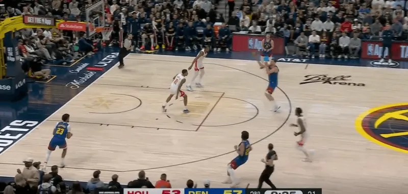 转换进攻掘金四打二,约基奇身后跟进,利用火箭两名退防人优先回收禁区,直接找到左侧外弹重新定位的约翰逊命中底角三分: