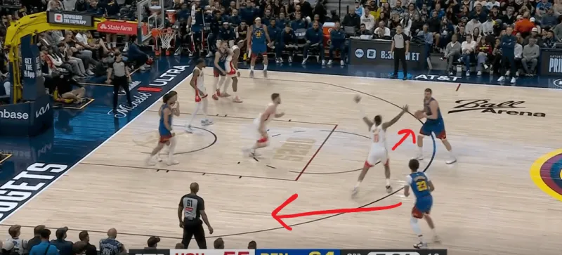 火箭进攻被逼至底线附近,约基奇及时提上封锁了小史密斯的接球线路: